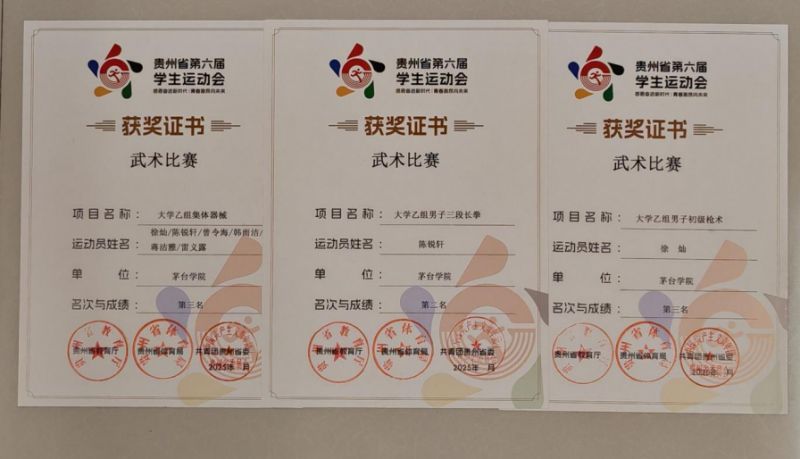 茅台学院武术队在学校大力支持下,作为没有体育院系的学校申请跨组参加了大学乙组(体育专业组)的比赛,顽强拼搏,取得了优异的成绩。其中,陈锐轩获得三段长拳比赛第二名、徐灿获得初级枪术比赛第三名,韩雨洁、徐灿、陈锐轩、蒋洁雅、曾令海、雷义露参加集体器械比赛获得第三名,其他队员获得前八名的成绩。
