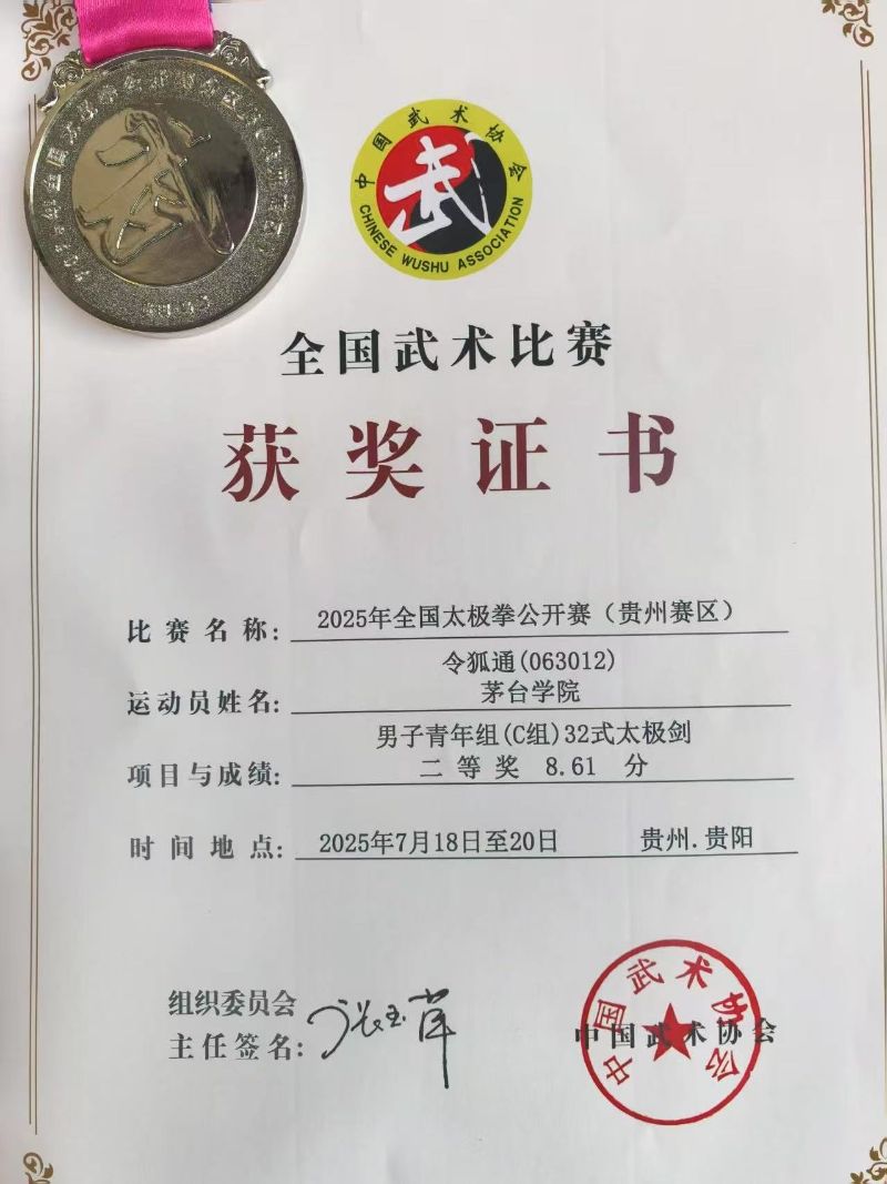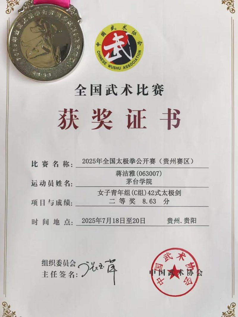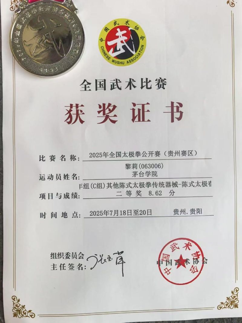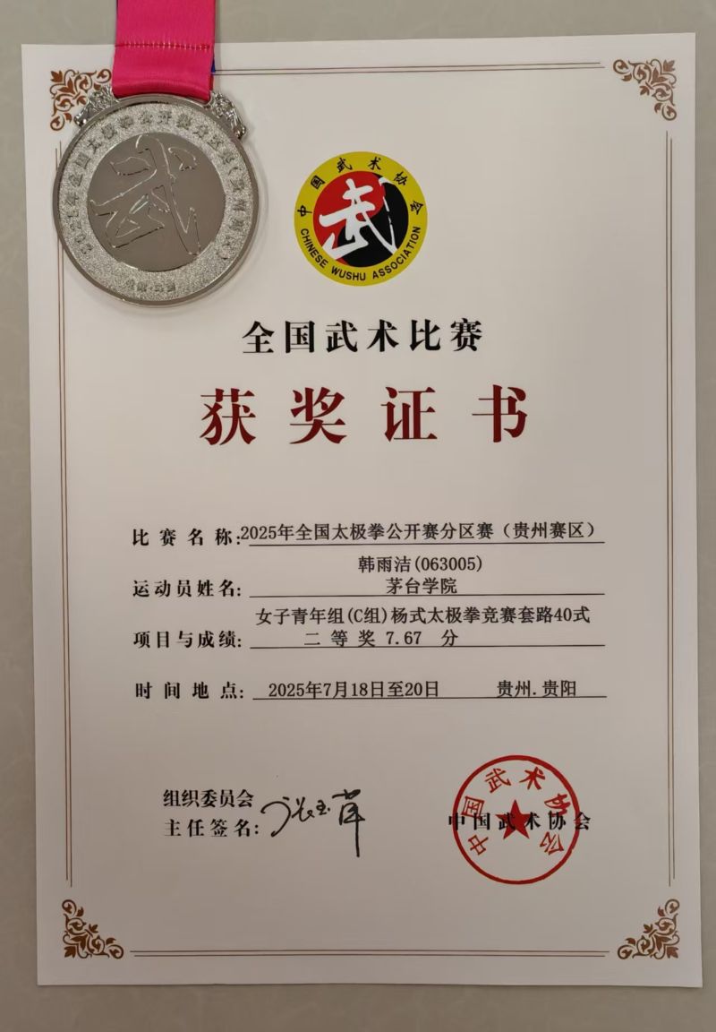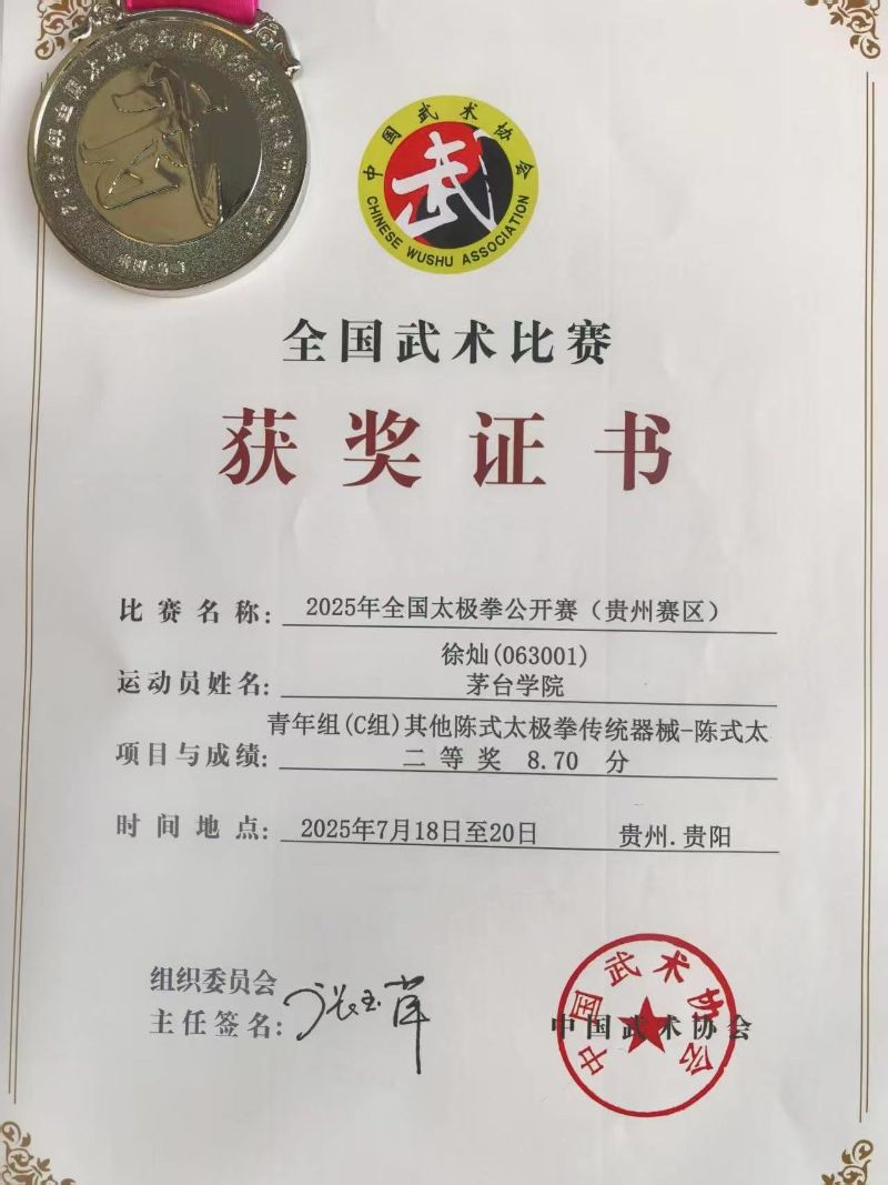茅台学院太极拳队在学校的大力支持下,共有13名运动员参赛,运动员们在老师的指导下刻苦训练、认真钻研,其中徐灿、韩雨洁、令狐通、蒋洁雅、黎莉、黎莉等在比赛中获得了二等奖的成绩。