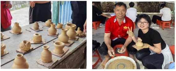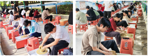 抵达花茂土陶基地后,非遗匠人现场讲解土陶历史文脉、传承价值与安全规范。同学们依次参观土陶博物馆,系统了解花茂土陶的非遗脉络、经典作品与工艺演变,在沉浸式体验中感受传统手工艺的独特魅力。同学们从“选泥、采泥、炼泥、割泥、拉坯、上釉、成品”全过程体验。尤其在拉坯实操环节,同学们全程低头专注、沉浸式投入,不少同学沉浸其中、乐在其中,结束时仍舍不得离开,真正做到动手、动心、动情。