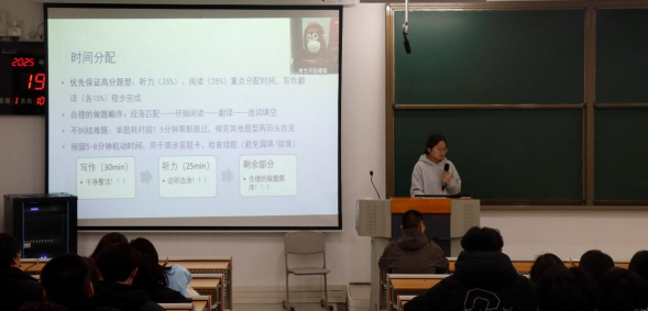 分享会上,自动化232班的陈培敏同学就英语四、六级备考,展开了详细介绍。她从词汇积累、听力训练、阅读理解、写作翻译等各个模块入手,向新生们分享了自己的学习方法和时间管理技巧,并建议大家从大一开始制定合理学习计划,充分利用好学校提供的英语学习资源。