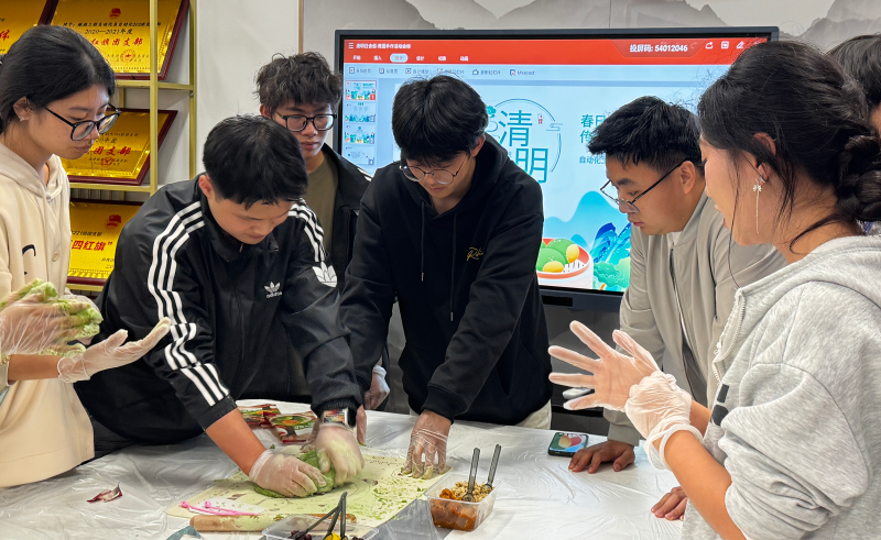 制作环节,同学们热情高涨、踊跃参与。大家洗净双手,揉面团、包馅料、塑造型,从生疏试探到熟练操作,互相分享技巧、协作配合。指尖流转间,一个个圆润饱满、色泽翠绿的青团陆续成型,现场暖意融融,欢声笑语不断。同学们在动手实践中感受传统手工的魅力,在沉浸式体验中触摸文化温度。