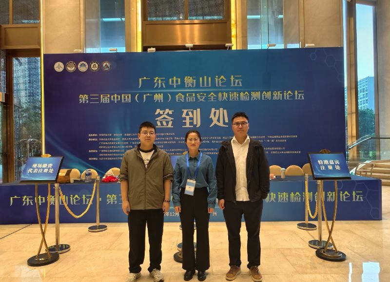 由华南农业大学、南昌大学、华南理工大学、暨南大学和广东省科学院微生物研究所等单位主办的第三届中国(广州)食品安全快速检测创新论坛于2025年12月19-21日在广州召开。茅台学院食品工程学院宋亚博士、杨文平博士、赵驰博士应邀前往交流。杨文平博士作了题为《基于氧空位纳米酶的亚硝酸盐智能手机传感》的专题报告。