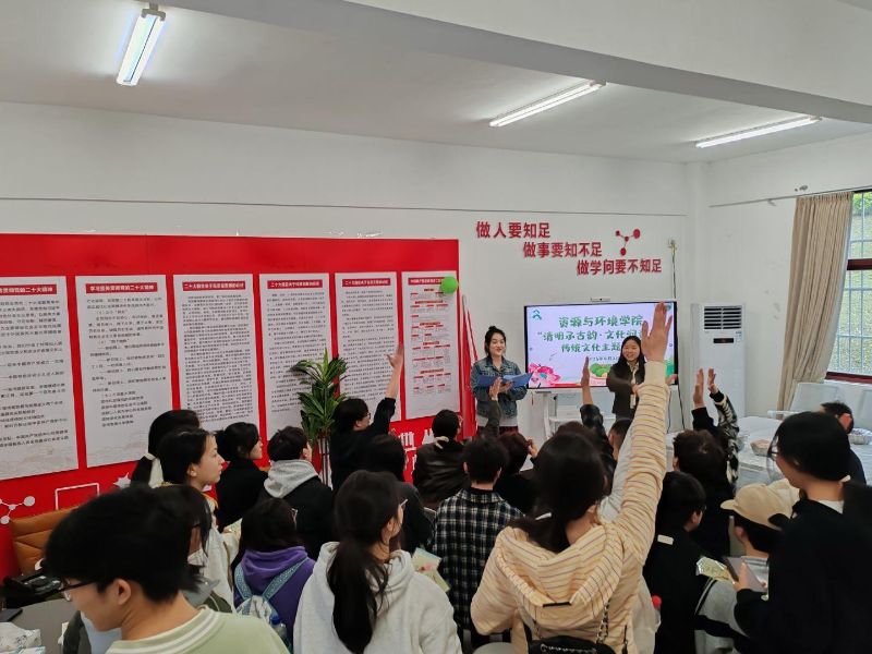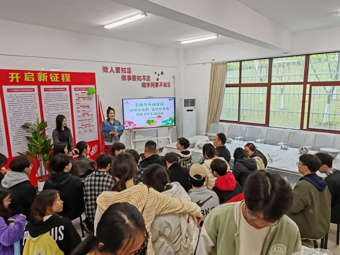 传统文化宣讲环节,学院“青衿蕴古”传统文化宣讲团代表蓝思媛围绕清明节的起源演变、历史典故、民俗风情及文化内涵进行了系统而生动的讲解。她从寒食禁火的古老传统到踏青插柳的民间习俗,从慎终追远的祭祖传统到生机勃发的迎春意蕴,层层递进地展现了清明节作为中华民族重要传统节日的深厚底蕴。通过宣讲,同学们深刻理解了清明节承载的敬祖尊宗、感恩思源的文化基因,以及在当代社会中传承优秀传统文化的重要价值。