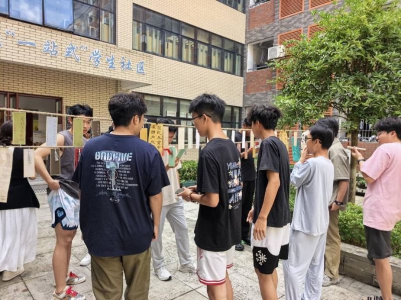 落日余韵倾洒进社区户外庭院,“‘易’起猜灯谜”活动在黄昏时刻拉开帷幕。灯谜内容涵盖学校文化、专业知识和中秋传统三大类,融趣味性与教育性于一体。现场氛围热闹浓烈,同学们踊跃竞猜,在欢声笑语中增进对传统文化、学校底蕴和学科特色的理解。