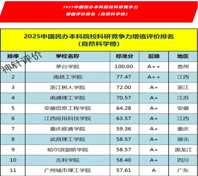 6月9日,神针评价(SZPJ)发布“2025年中国民办本科院校科研竞争力排名”,380所民办本科院校作为评价对象。排名显示,茅台学院在2025年中国民办本科院校科研竞争力增值评价(自然科学榜)跃居榜首(排名第一),科研竞争力实力(自然科学榜)排名第三,评级均为A++;人文社科榜评级C+及以上,位于前50%。此外,学校成功入选2025年自然科学榜最佳科研生态位民办本科院校名单。