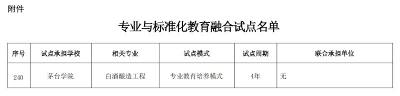 近日,国家市场监督管理总局、教育部联合印发了《关于公布专业与标准化教育融合试点名单的通知》,公布了全国首批专业与标准化教育融合试点名单,全国共281个试点项目入选,茅台学院白酒酿造工程专业跻身其中。