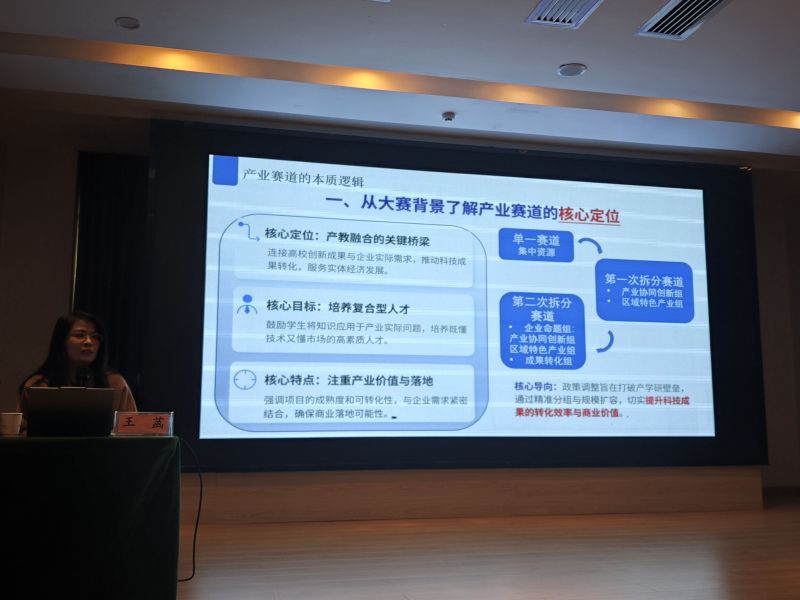 在产业赛道模块,北京邮电大学王菡副教授围绕“产业赛道评审解析与PPT设计要点”展开分享,系统梳理了产业赛道的本质逻辑、评分规则变革及PPT可视化表达技巧,为我校师生在企业命题组与成果转化组的项目材料准备提供了精准指导。