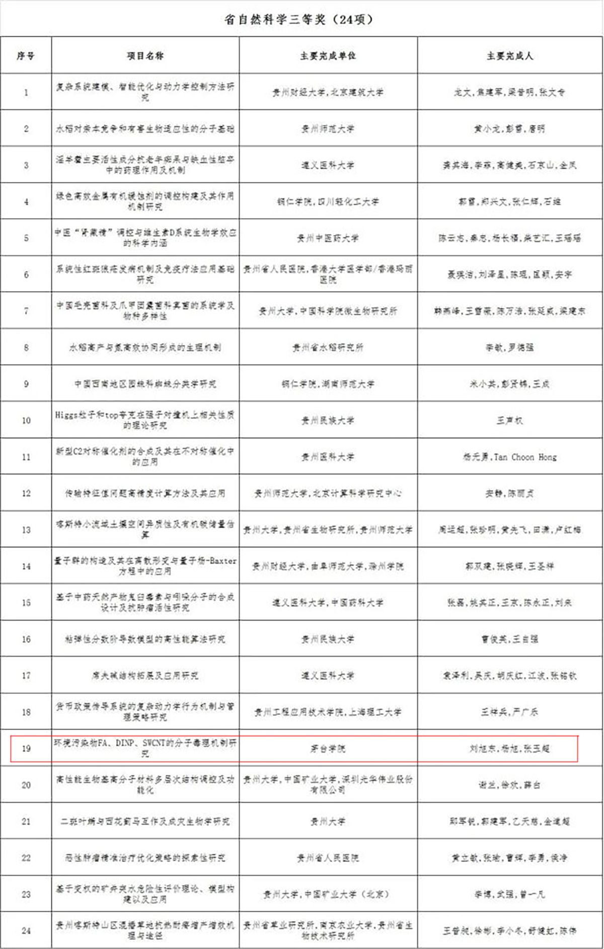 On May 24th, according to the Department of Science and Technology of Guizhou, MTI was awarded the third place in the nature science realm of 2020 Guizhou Scientific Award, for the research on 《FA, DINP, and SWCNT as environmental pollutants in molecular toxic mechanism》.