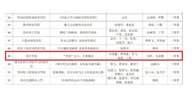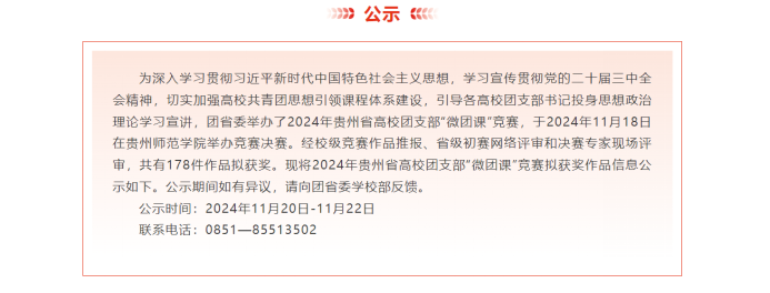 近日,团省委举办了2024年贵州省高校团支部“微团课”竞赛,经校级竞赛作品选拔推报、省级初赛网络评审和决赛专家现场评审,我校作品《风起浪腾扬新帆——新时代青年学生应坚持的成长成才观》和《“平语”近人,青春解读》斩获佳绩!