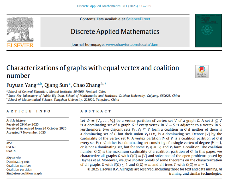 近日,茅台学院通识教育学院杨富元老师作为第一作者,联合贵州大学和扬州大学,在组合数学领域国际权威期刊《Discrete Applied Mathematics》上发表了题为“Characterizations of graphs with equal vertex and coalition number”的研究论文。该项成果以茅台学院为第一完成单位。