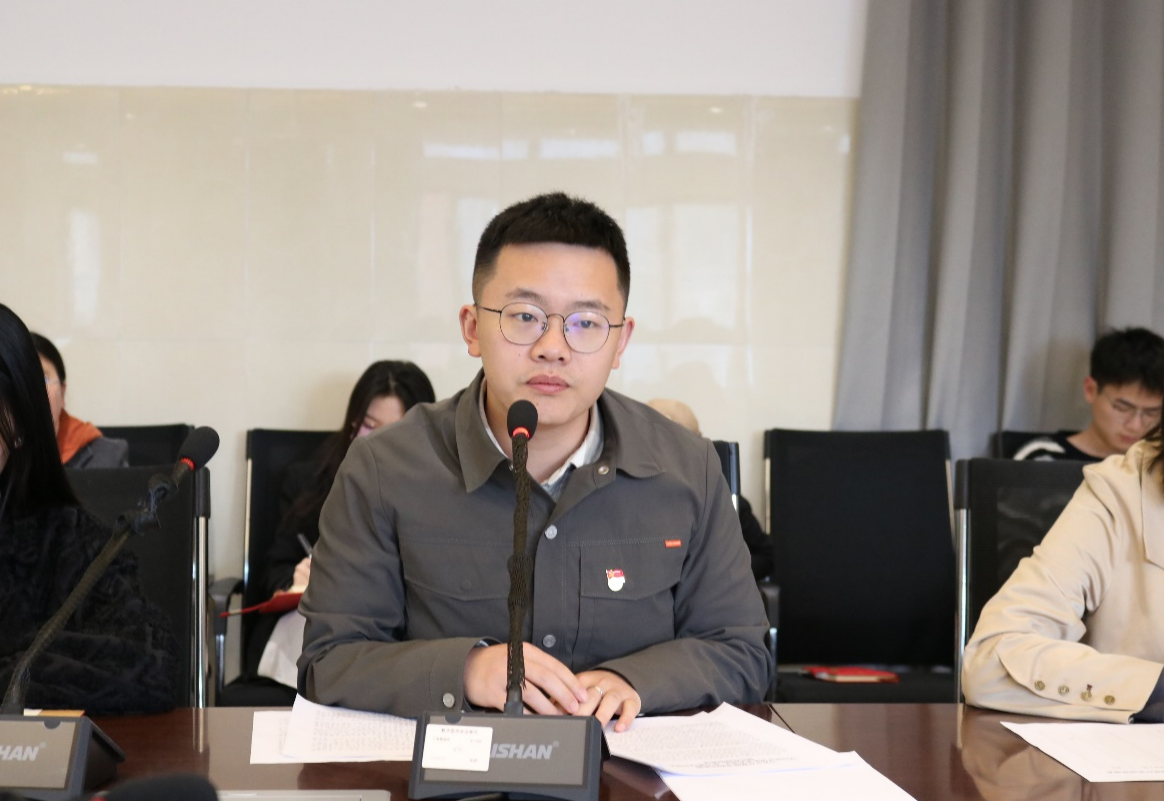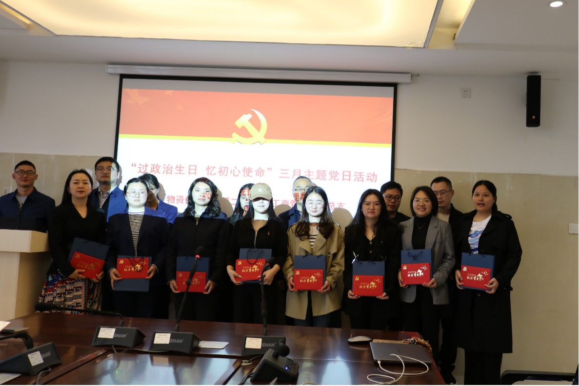 第三项议程是物资供应中心党支部书记陈宗飘、工商管理系教职工党支部书记柏传超现场为中共党员发放政治生日贺卡。