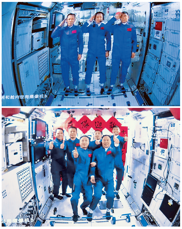 新时代十年,我国经济实力、科技实力、综合国力跃上新的大台阶,推进科技自立自强,创新型国家建设取得重大进展。图为拼版照片:上图为2021年6月17日神舟十二号3名航天员顺利进驻天和核心舱,标志着中国人首次进入自己的空间站。下图为2023年5月30日在北京航天飞行控制中心拍摄的神舟十五号航天员乘组与神舟十六号航天员乘组拍下“全家福”的画面。