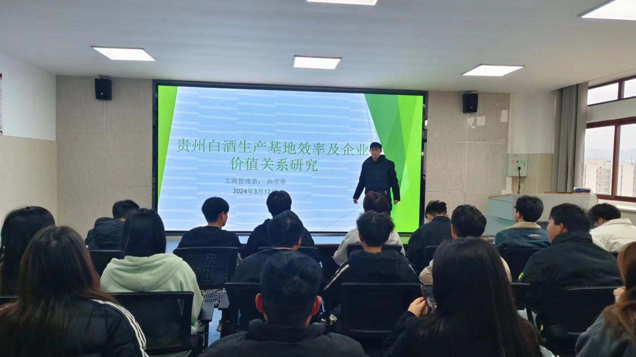 贵州白酒生产基地的发展存在哪些问题,如何促进贵州白酒企业的高质量发展?为进一步提升工商管理系师生对贵州白酒生产基地效率及贵州白酒企业价值的研究水平,促进更多贵州白酒生产基地研究的成果产出,3月12日,工商管理系孙宗帝博士在明德楼516会议室开展了题为“贵州白酒生产基地效率及企业价值关系研究”的工商论坛。