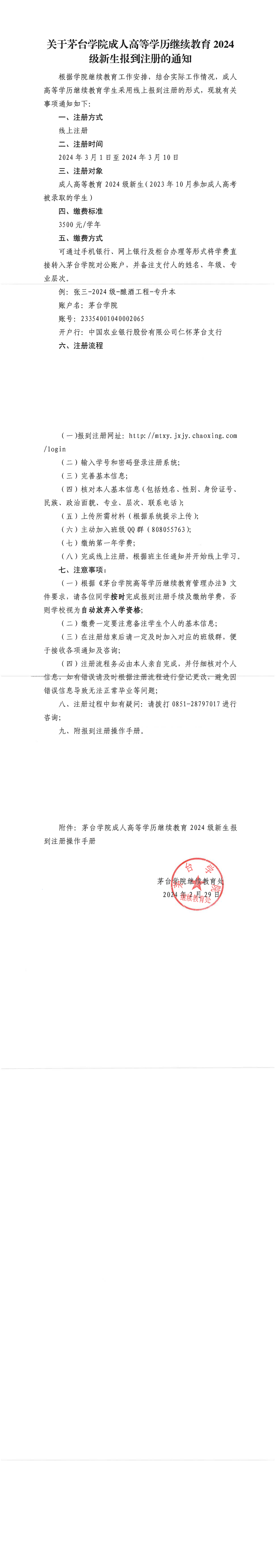 关于茅台学院成人高等学历继续教育2024级新生报到注册的通知