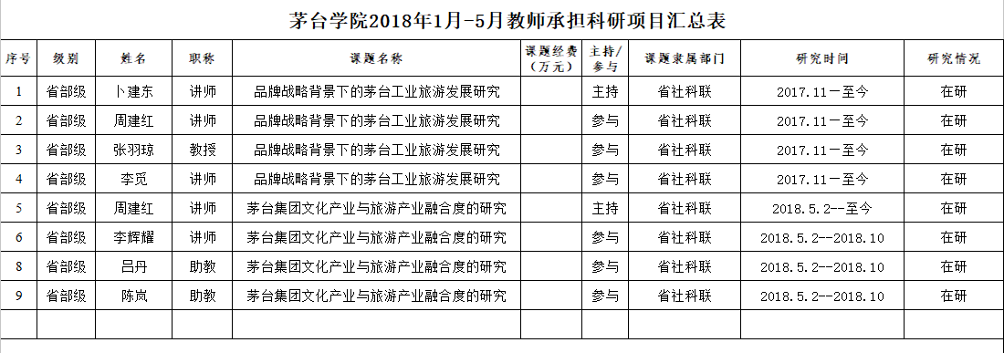 茅台学院2018年1月-5月教师承担科研项目汇总表