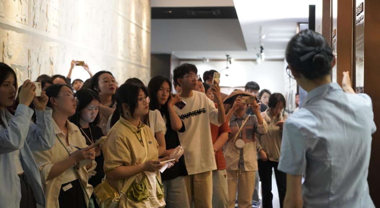 来到“中国酒文化城”,这是一座集雕塑、书画、藏匾、碑刻、文物、实物酒品于一体的酒类博览馆。在该文化城专业讲解员的导游和介绍下,同学们开启了新模式下的导游讲解技能学习。首先从第一展馆——中国酒源馆出发,学习了解了中国酿酒起源,这不仅是酿造工艺的发明与创造,还是东方古老文明的奇思与妙想,更是从中国酿酒起源的传说、出土古酒、酿酒流程、中国酒礼、酒政等内容的学习过程中,学生通过现场直观感受导游讲解技能技巧,在学习技能的同时,还深入了学习解了博大精深的中国酒文化。