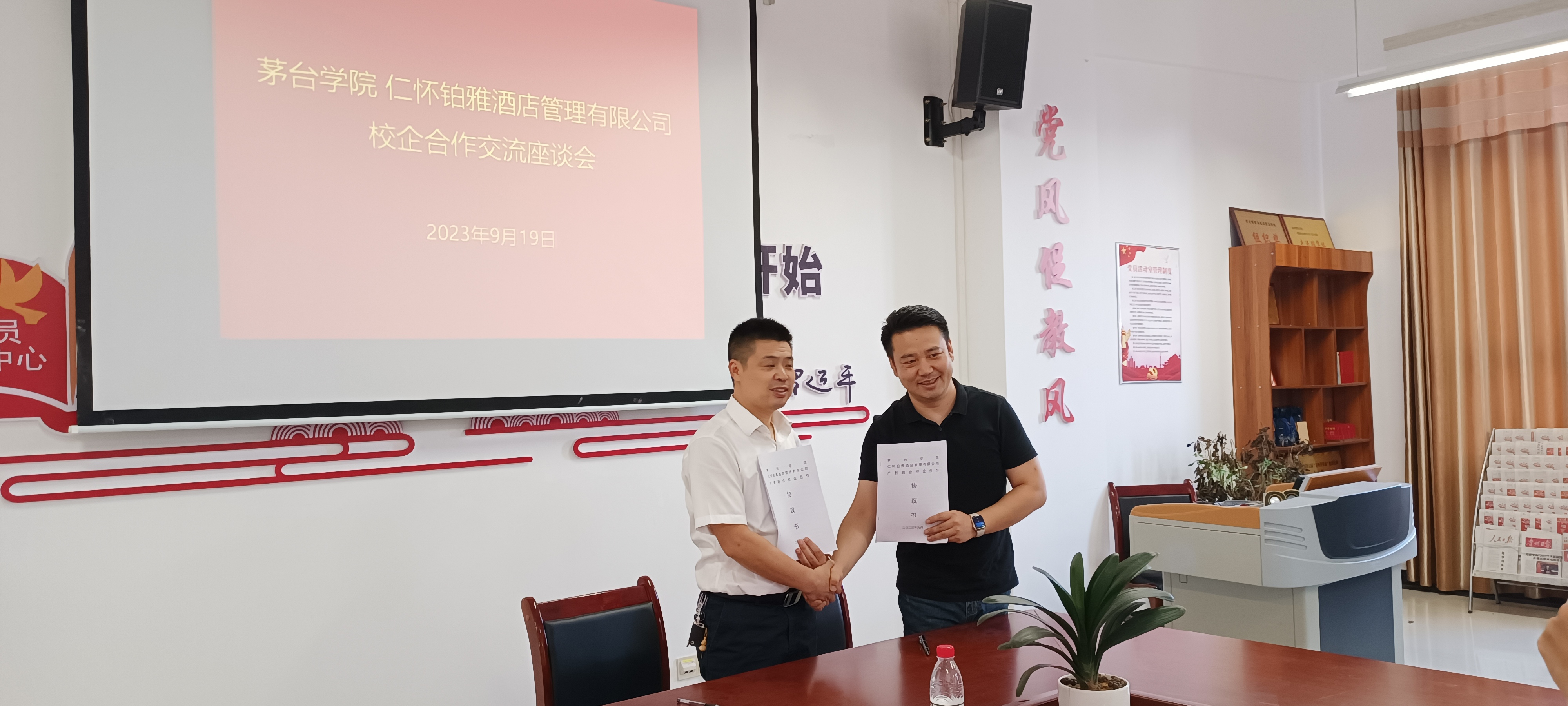 为进一步深化校企合作,紧密人才培养社会需要,9月19日下午,茅台学院旅游管理系邀请仁怀铂雅酒店管理有限公司总经理张振洲一行到校,开展校企合作签约座谈会。茅台学院党委委员、副校长田戊戌出席座谈。