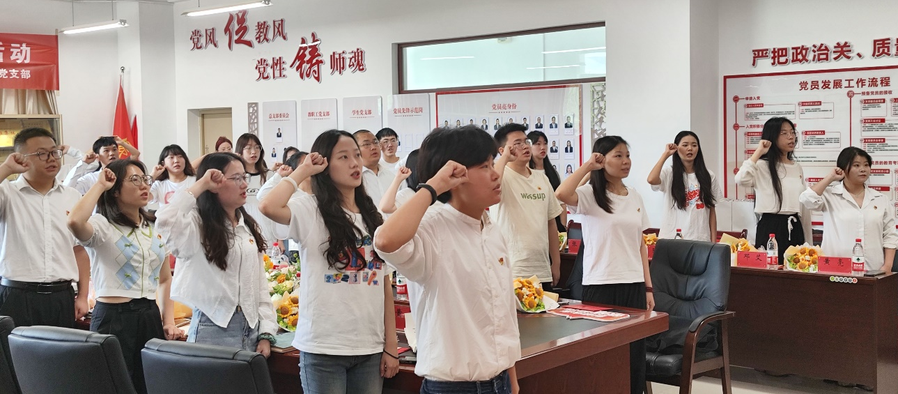 在酿酒工程系学生党支部书记刘晓晓同志的引领下,参会教师党员为毕业生党员佩戴党员徽章,所有党员在党旗下宣誓,重温入党誓词,时刻铭记自己入党的初衷,坚定信念,勇往直前,不断超越自我,实现自我价值。