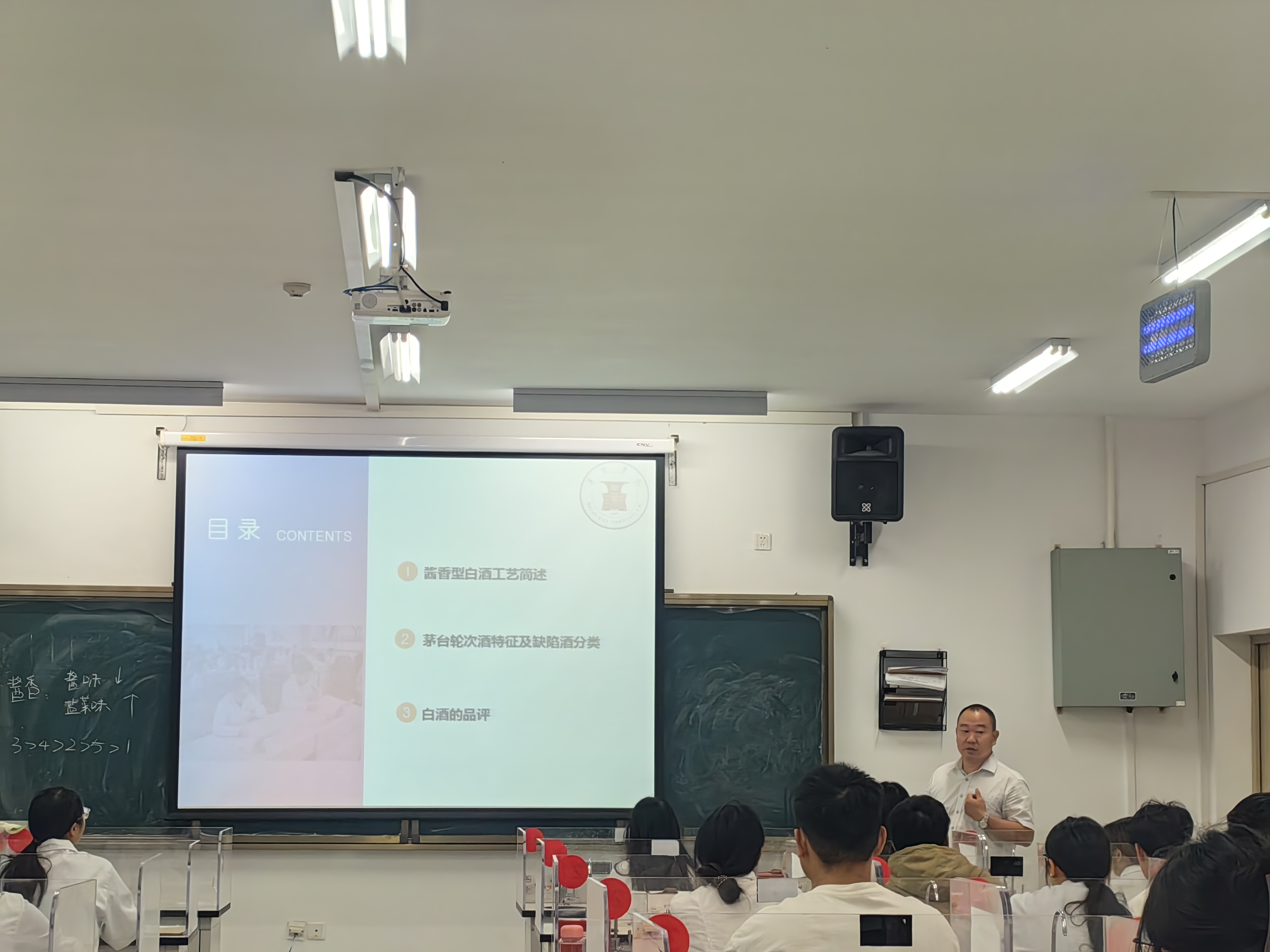 2024年5月21日,贵州茅台股份有限公司制酒二十八车间主任杨喜讯到我校为我系学生授课,讲授关于“酱香型白酒轮次基酒品评”的相关内容。杨喜讯主任重点围绕酱香型白酒工艺特点、各轮次基酒的风味特点、轮次基酒品评等内容展开本次授课。在授课的过程中,杨主任结合自身丰富的工作经验,将课堂理论与实际生产紧密结合,让学生理解各轮次基酒特征的形成原因,更好的对酱香轮次基酒感官有清晰的认识,增加学生对白酒品评的兴趣和白酒品评课程的热爱。