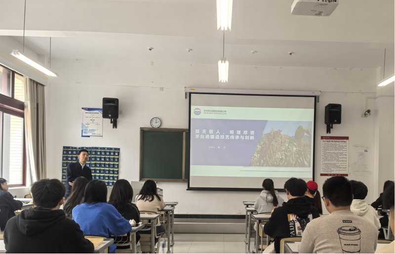 2025年4月7日,贵州茅台酒股份有限公司制酒十八车间主任陈名到我校为酿酒工程学院学生授课,讲授题为《“顺天敬人、明理厚德”——茅台酒酿造技艺传承与创新》的课程内容。