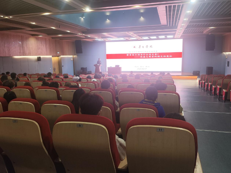 讲座中,杨亮教授结合多年科研实践,用通俗易懂的语言,系统讲解了高温大曲微生物群落、代谢机制,以及微生物发酵与酱香风味形成的内在联系,深入浅出揭开了“酱香为何香”的科学奥秘,内容专业、条理清晰,让在场学生对酿造微生物学科有了更直观、更系统的认识。