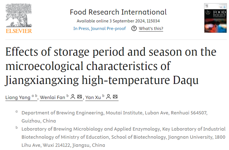 2024年9月,酿酒工程系杨亮博士在国际期刊《Food Research International》(Q1, Top,IF: 7)发表题为“Effects of storage period and season on the microecological characteristics of Jiangxiangxing high-temperature Daqu”的研究性论文。研究获国家自然科学基金(32160553)、贵州省科技计划基础研究项目(黔科合基础-ZK[2021]一般093)、遵义市科技与大数据局(遵市科合HZ字(2023)108号、茅台学院高层次人才科研启动经费项目(mygccrc[2022]005))等项目资助。