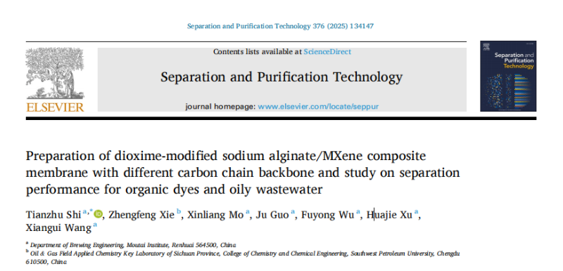 近日,茅台学院酿酒工程学院绿色酿造技术团队史天柱博士(第一作者,通讯作者)在国际知名TOP期刊《Separation and Purification Technology》(IF: 9.0,中国科院2区)上发表了题为“Preparation of dioxime-modified sodium alginate/MXene composite membrane with different carbon chain backbone and study on separation performance for organic dyes and oily wastewater”的研究论文。