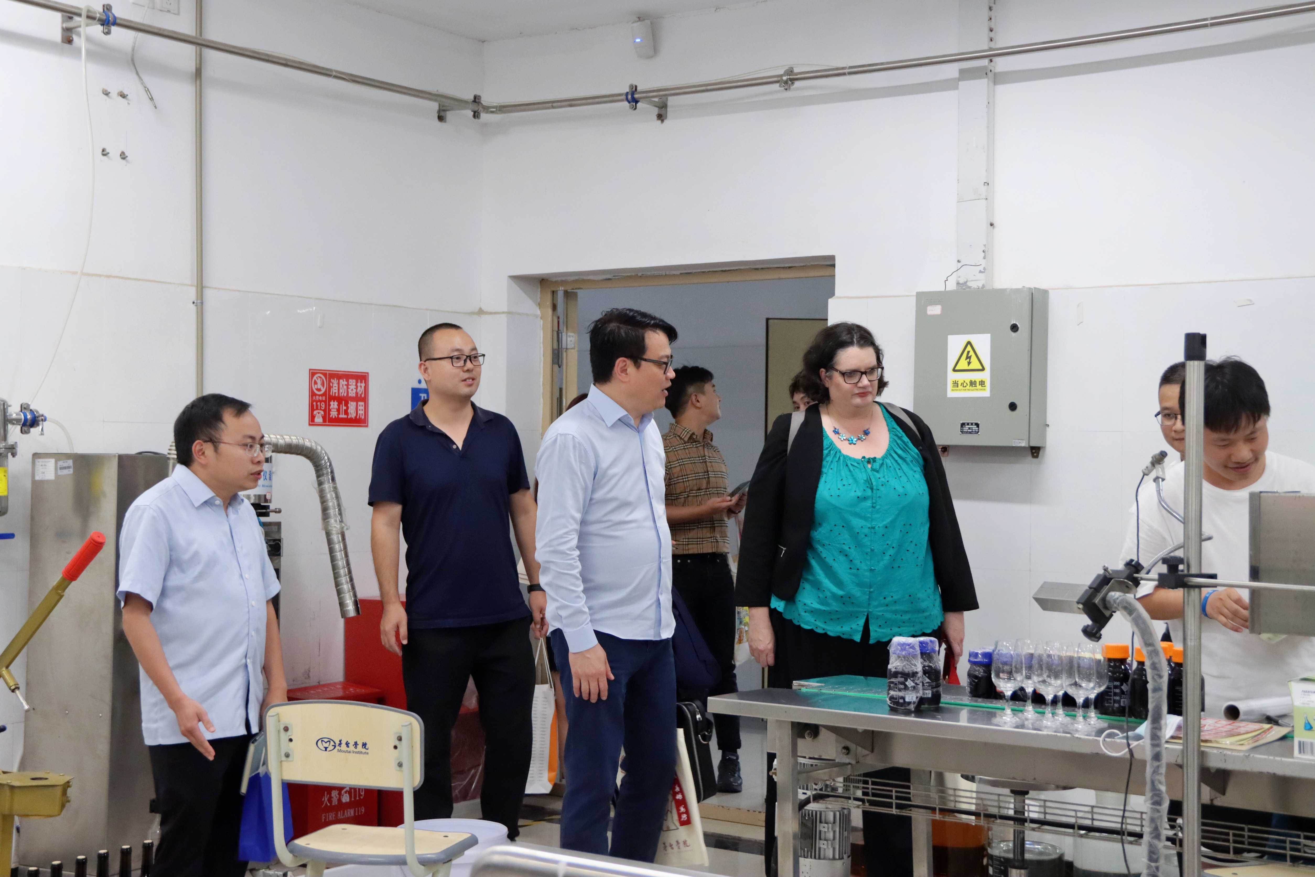 座谈会后,一行人来到我系实验室参观啤酒生产线。我系负责人为走访团详细介绍了实验室啤酒发酵设备、发酵流程等,邀请大家品尝我系生产的特色啤酒,并就啤酒生产、风味、品评等展开交流。