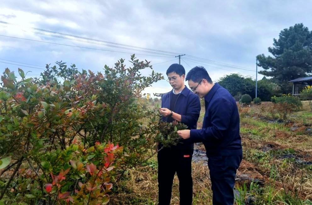 一行人首先参观了贵州蓝莓产业发展展示厅,了解了近年来蓝莓产业发展现状、相关政策及科研动态。调研小组通过实地考察、与当地农户交流等方式,了解到当地蓝莓病虫害频发,随后便为农户普及了蓝莓各种病虫害绿色防控技术,并讲授了蓝莓酒酿造工艺。