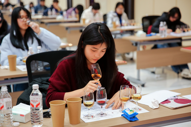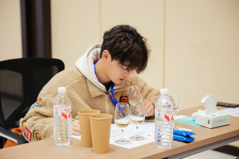 本次大赛考核标准严苛、维度全面,既对选手的葡萄酒专业理论储备进行系统检验,更重点考察外观识别、香气辨析、口感品鉴、综合质量评估等感官分析实战能力,多轮高难度的盲品考核,对选手的专业素养、临场应变与心理素质均提出极高要求。比赛中,茅台学院学子严格遵循专业品鉴步骤,细致观察酒液特质,敏锐捕捉各类香气变化,精准剖析酒体结构,准确判断酒款品种与产区特征并完成逻辑严密的专业品酒笔记,展现出扎实的专业功底和良好的赛场风貌。