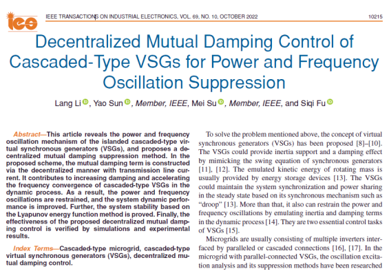 2022年上半年,茅台学院酿酒工程自动化系李浪博士在自动化领域国际顶级期刊《IEEE Transactions On Industrial Electronics》(中国科学院一区Top期刊,影响因子8.126)上,以茅台学院为第一单位发表了题为“Decentralized Mutual Damping Control of Cascaded-Type VSGs for Power and Frequency Oscillation Suppression”的科技论文。