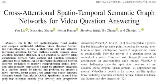 2022年上半年,茅台学院酿酒工程自动化系刘赟博士在多模态数据分析领域国际顶级期刊《IEEE Transactions on Image Processing》(中国科学院一区Top期刊,中国计算机学会推荐A类国际期刊,影响因子11.041)上,以茅台学院为第一单位发表了题为“Cross-Attentional Spatio-Temporal Semantic Graph Networks for Video Question Answering”的科技论文。