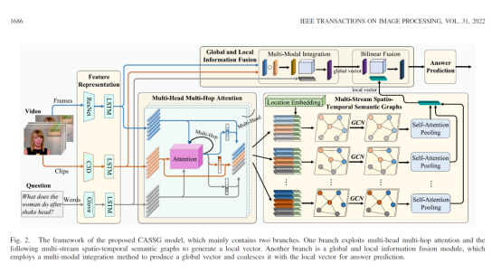 论文主面向人工智能领域中的视觉问答任务开展研究,提出了一个新颖的跨模态注意力时空语义图网络(CASSG)。首先,设计一个多头多跳注意力模块,用以探索视频内容和单词序列之间的交互。它旨在通过多视角和渐进式关注的方式来捕获细粒度的多模态关系。多样性和渐进性的设计使其能够产生更清晰的注意力分布。其次,基于交叉关注的多模态特征(即交叉嵌入的视频和问题表示)构建多流时空语义图。图的每个节点对应于一个视频帧、剪辑和问题单词,而节点之间的边代表两个节点之间的关联关系。通过图卷积神经网络对构造的多流异构图执行模态间和模态内相关性的同步推理。最后,由于图结构推理模型更多地关注于局部因素之间的相互作用,因此论文进一步提出了全局和局部信息融合模块,用以融合从异构图学习的局部推理向量和从另一分支学习的全局向量。利用融合后的多模态特征向量进行答案推导。