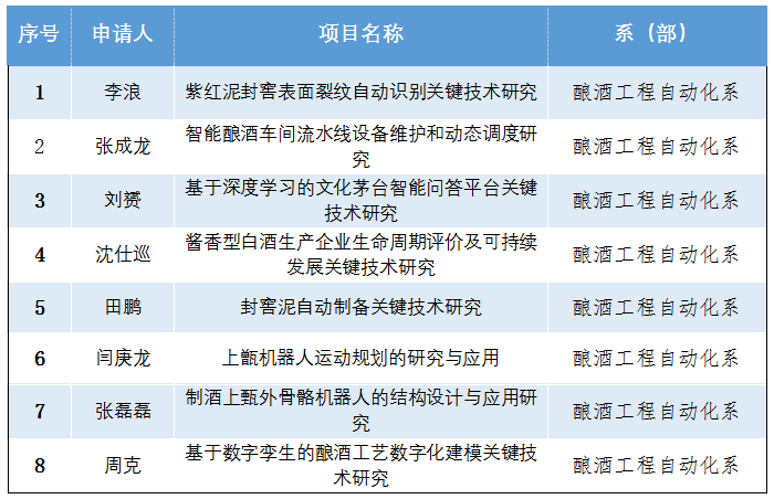 近日,根据《2022年遵义市科技与大数据局、茅台学院市校联合科技合作资金项目立项通知》(茅台学院科通[2022]27号),经相关领域校外专家评审组评审、公示等程序,遵义市科技局共批准我校立项项目18项,其中茅台学院酿酒工程自动化系共立项项目8项。相关信息见下表: