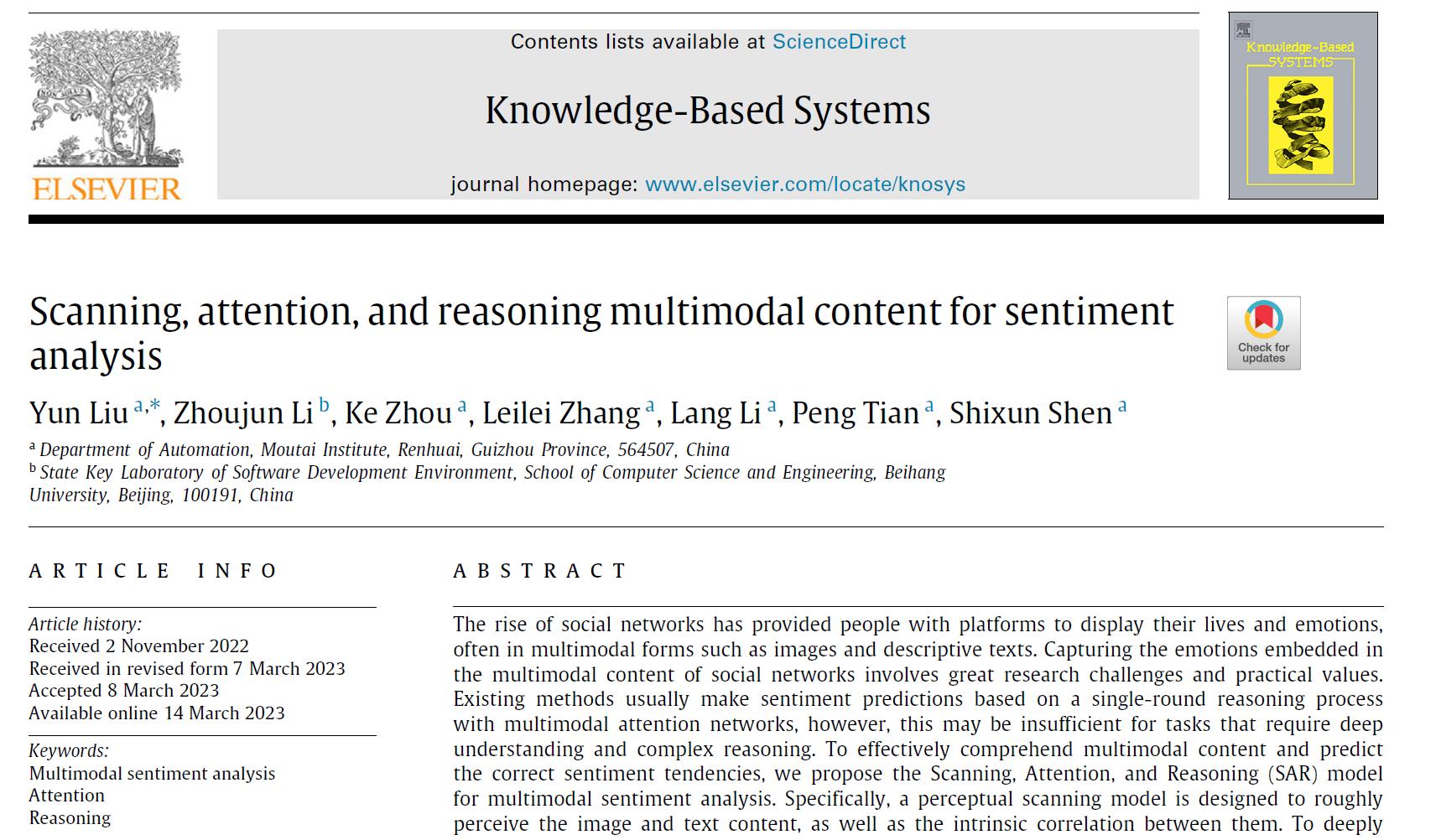 近日,茅台学院与北航计算机学院在国际期刊《Knowledge-Based Systems》(中国科学院1区期刊,影响因子8.139)上联合发表了题为“Scanning, attention, and reasoning multimodal content for sentiment analysis”的科技论文。茅台学院酿酒工程自动化系刘赟博士为论文第一作者及通讯作者。