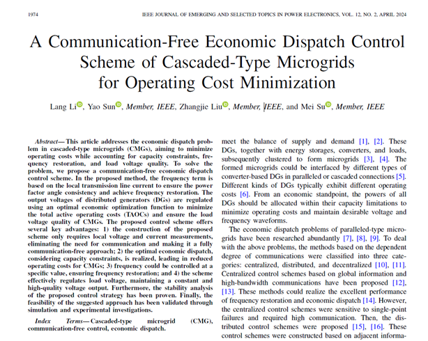 茅台学院与中南大学在国际期刊《IEEE JOURNAL OF EMERGING AND SELECTED TOPICS IN POWER ELECTRONICS》(中国科学院2区,影响因子IF=4.6)上联合发表了题为“A Communication-Free Economic Dispatch Control Scheme of Cascaded-Type Microgrids for Operating Cost Minimization”的科技论文。茅台学院酿酒工程自动化系李浪博士为论文第一作者。