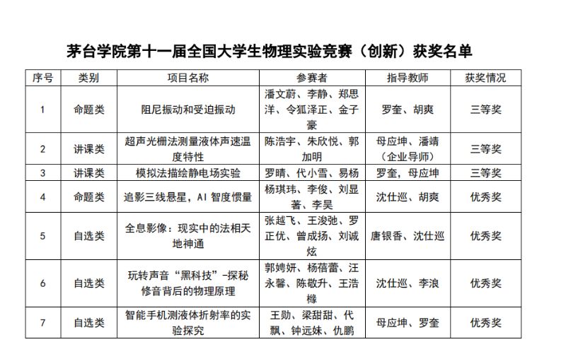 近日,随着第十一届全国大学生物理实验竞赛(创新)决赛落下帷幕,获奖名单正式揭晓。在和全国700余所本科高校同台竞技中,茅台学院自动化工程学院积极组织学生参赛,共获7个奖项,其中,三等奖3项、优秀奖4项。