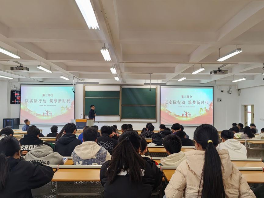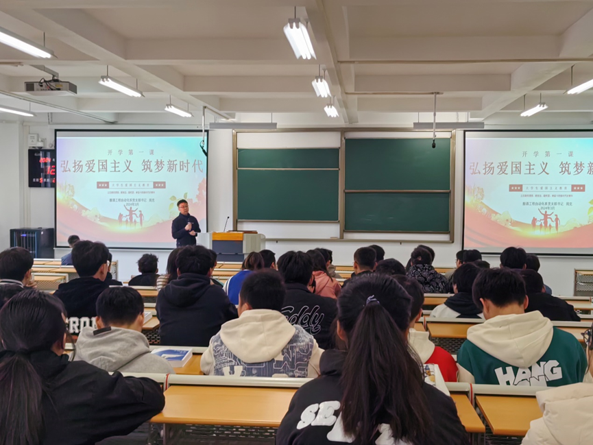 为进一步推动习近平新时代中国特色社会主义思想进校园,引导广大青年传承和弘扬爱国主义精神,2024年3月15日,酿酒工程自动化系党支部书记周克在A1-512教室,为本系2023级学生、2021级专升本学生讲授《弘扬爱国主义 筑梦新时代》为主题的“开学第一课”。