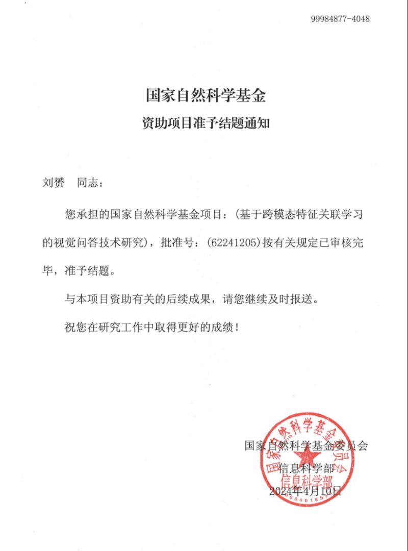 近日,茅台学院酿酒工程自动化系刘赟博士主持的国家自然科学基金专项项目“基于跨模态特征关联学习的视觉问答技术研究”顺利完成项目结题。这是茅台学院首个结题的国家自然科学基金项目,标志着酿酒工程自动化系在科学研究领域迈出了重要的一步,也为我系未来开展高水平科研工作奠定了坚实基础。