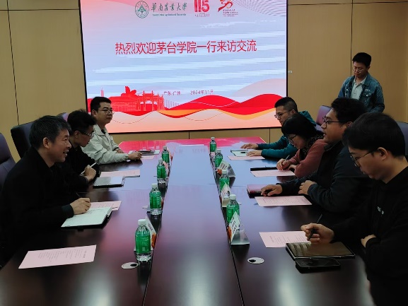 团队与华南农业大学食品学院与会代表就横向课题和国际项目的申报、兄弟院校定点帮扶、高水平SCI论文的发表等进行了全面深入的交流研讨。华南农业大学与会代表充分肯定了茅台学院的办学优势和特色,并开诚布公地分享了其食品与营养专业申报的优势和面临的一些难题。与会人员一致认为,大健康背景下食品与营养专业必将迎来发展高潮。