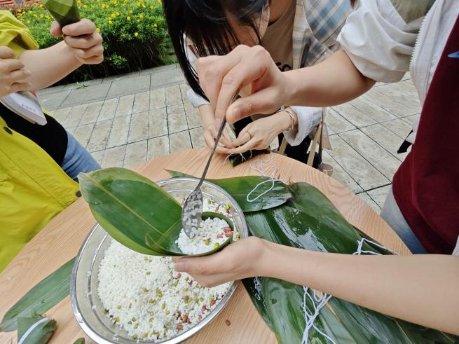 活动现场,糯米、粽叶、蜜枣、红豆等材料摆放整齐,大家在认真地学习了包粽子的方法后,开始制作起了自己的粽子。工作人员特地准备了室内教学区和室外教学区,让会包的同学负责教授不会包的同学,更好地激发同学们参与的积极性,同学之间齐心协力,其乐融融。