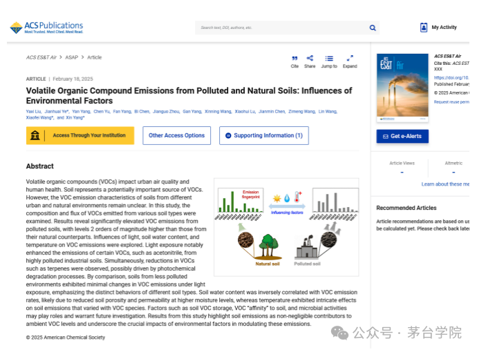 近日,茅台学院资源环境系刘亚曦博士与复旦大学、南方科技大学及贵州茅台酒股份有限公司相关研究人员携手合作,以茅台学院为第一单位在国际环境期刊《ACS ES&T Air》发表了题为“Volatile Organic Compound Emissions from Polluted and Natural Soils: Influences of Environmental Factors(污染及自然土壤在自然界驱动条件下对大气挥发性有机物的排放情况)”的研究性论文。
