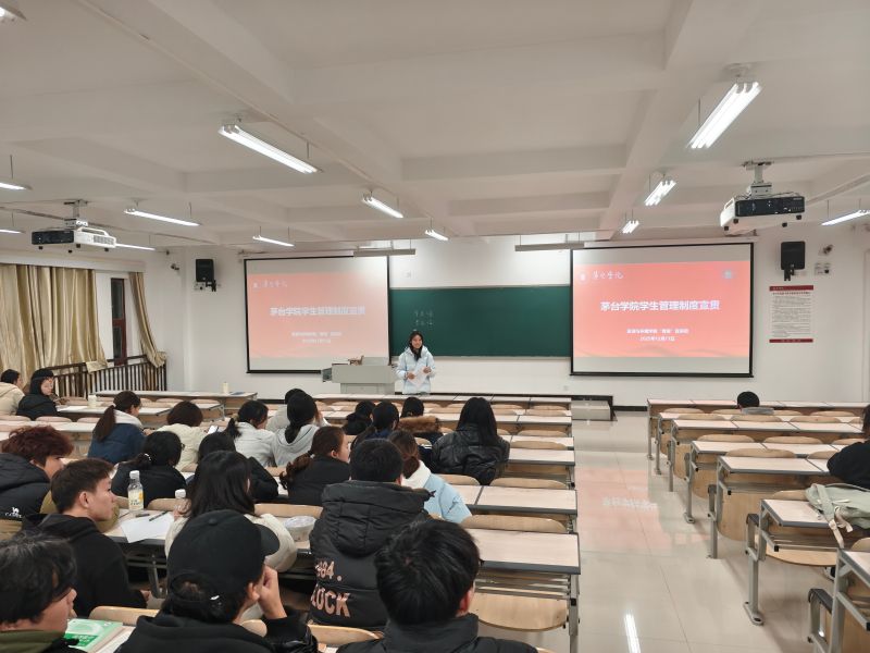 活动伊始,栾康老师简要介绍了本次宣贯活动的背景和重要意义,强调了熟悉校规校纪对适应大学生活、保障学业顺利的重要性。在宣贯环节,宣讲团为全体新生发放了《茅台学院学生手册》和《学生违纪案例汇编》,栾康老师结合大量生动案例,对《学生手册》中学士学位授予实施细则、学生管理规定、学生宿舍管理规定、学生违纪处分办法等关键规章制度进行了系统梳理和深入解读,进一步帮助新生们了解掌握相关制度要点。最后宣讲团还对新生进行了诚信考试教育,鼓励动员同学们在接下来的期末考试当中认真复习、积极备考,杜绝任何形式的舞弊行为。