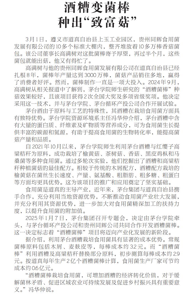 3月6日,《贵州日报》整版刊发《三业共进 动能澎湃——茅台现代化产业体系加速构建》专题报道,聚焦茅台酒业在现代农业、绿色制造、生态保护等领域的协同推进。文章中,《酒糟变菌棒,种出“致富菇”》一文重点介绍了茅台学院资源与环境学院冯华仲、张海燕科研团队在酒糟资源化利用方面取得的重要成果。