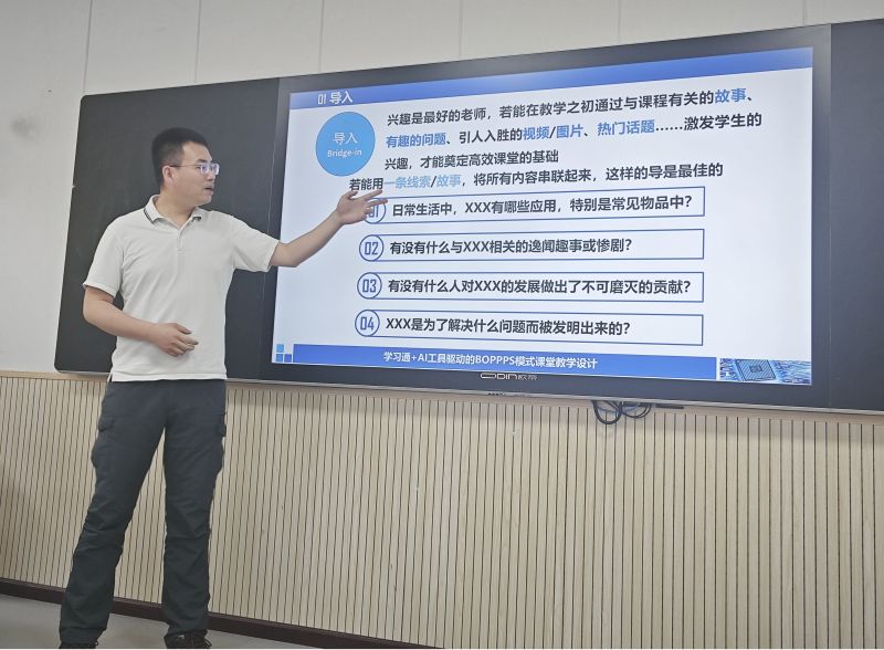 在讲座中,王陈诚副教授结合自身教学改革实践,深入解读了BOPPPS教学模式(导入、学习目标、前测、参与式学习、后测、总结)的结构要点,重点讲解了“学习通”等平台在支持教学目标设定、课堂互动与过程评价中的具体应用。在AI赋能教学环节,他分享了AI工具在学情分析、生成知识点歌词歌曲、探究式课堂导入设计等方面的实际案例,展示了技术如何激发课堂创新与学生兴趣。
