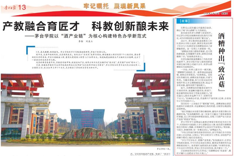2025年5月29日,《贵州日报》以整版形式刊发专题报道《产教融合育匠才 科教创新酿未来——茅台学院以“酒产业链”为核心构建特色办学新范式》,重点聚焦茅台学院在“产教融合、科教融合、校地协同”中的创新探索与成果经验。其中,我院“酒糟种出‘致富菇’”研究案例作为典型故事隆重呈现,充分展现了资源与环境学院在科研服务产业、服务乡村振兴方面的积极作为与社会贡献。