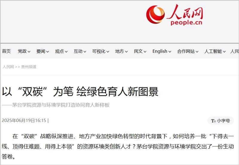 近日,茅台学院资源与环境学院的“双碳”育人模式分别在《贵州日报》和人民网贵州频道发布。文章聚焦学院在“双碳”战略背景下的育人创新实践,展示了学院在协同育人、产教融合和人才培养等方面的成果。