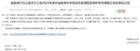 近日,贵州省教育厅办公室公布了《2025年贵州省教育科学规划年度课题暨粤黔专项课题立项名单》。全省共立项587项,其中重点课题70项、一般课题395项、青年课题86项、粤黔专项36项。茅台学院共有4项课题成功立项,其中一般课题3项、青年课题1项。