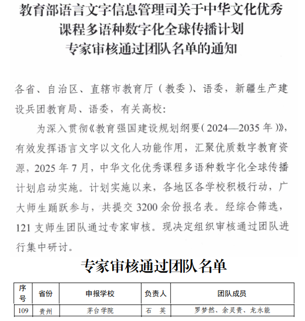 该计划由教育部语言文字信息管理司组织实施,旨在深入贯彻《教育强国建设规划纲要(2024—2035年)》,以汉字及其蕴含的中华文化为切入点,开发建设系列多语种数字化精品课程,推动中华文化全球传播。我校教师团队聚焦贵州多民族服饰文化,以汉字文化为基础,设计了“汉字解码贵州民族服饰”系列课程,生动展现中华民族服饰之美与文化底蕴。该课程团队从全国3200余支申报团队中脱颖而出,成功通过专家审核,成为全国121支入围团队之一。