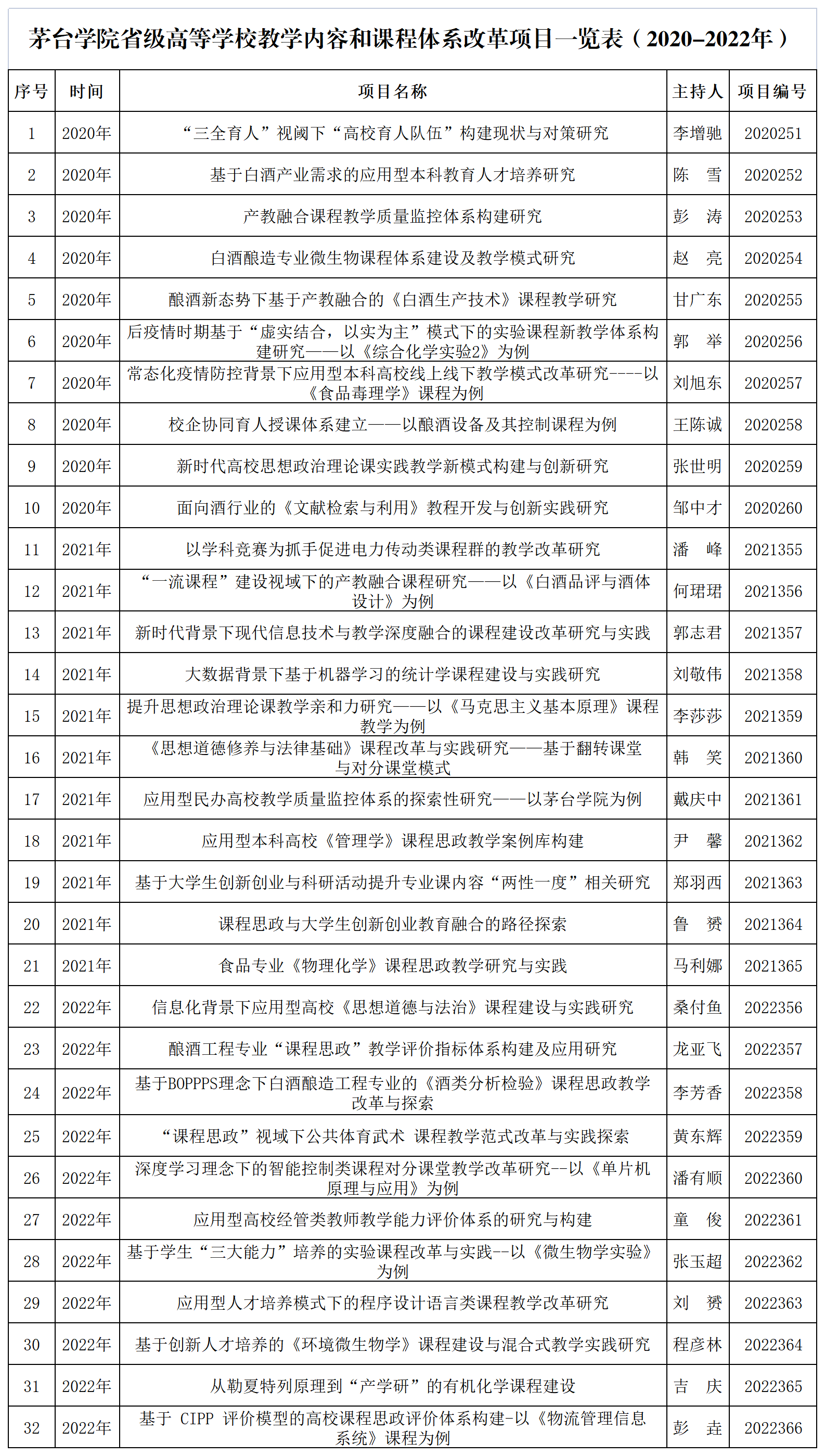 茅台学院省级高等学校教学内容和课程体系改革项目一览表(2020-2022年)